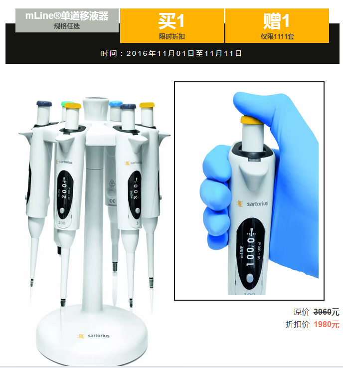 在这个疯狂的购物节日里,带给大家优惠的促销活动:mLine®单道移液器规格任选买1限时折扣赠1仅限1111套时间:2016年11月01日至11月11日